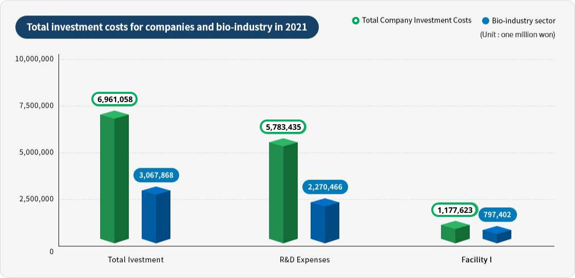 The total investment cost of bio-industry companies in 2021 was KRW 6.961.1 billion. The total investment in the bio-industry sector was KRW 3.067.9 billion, accounting for 44.1% of the total investment.